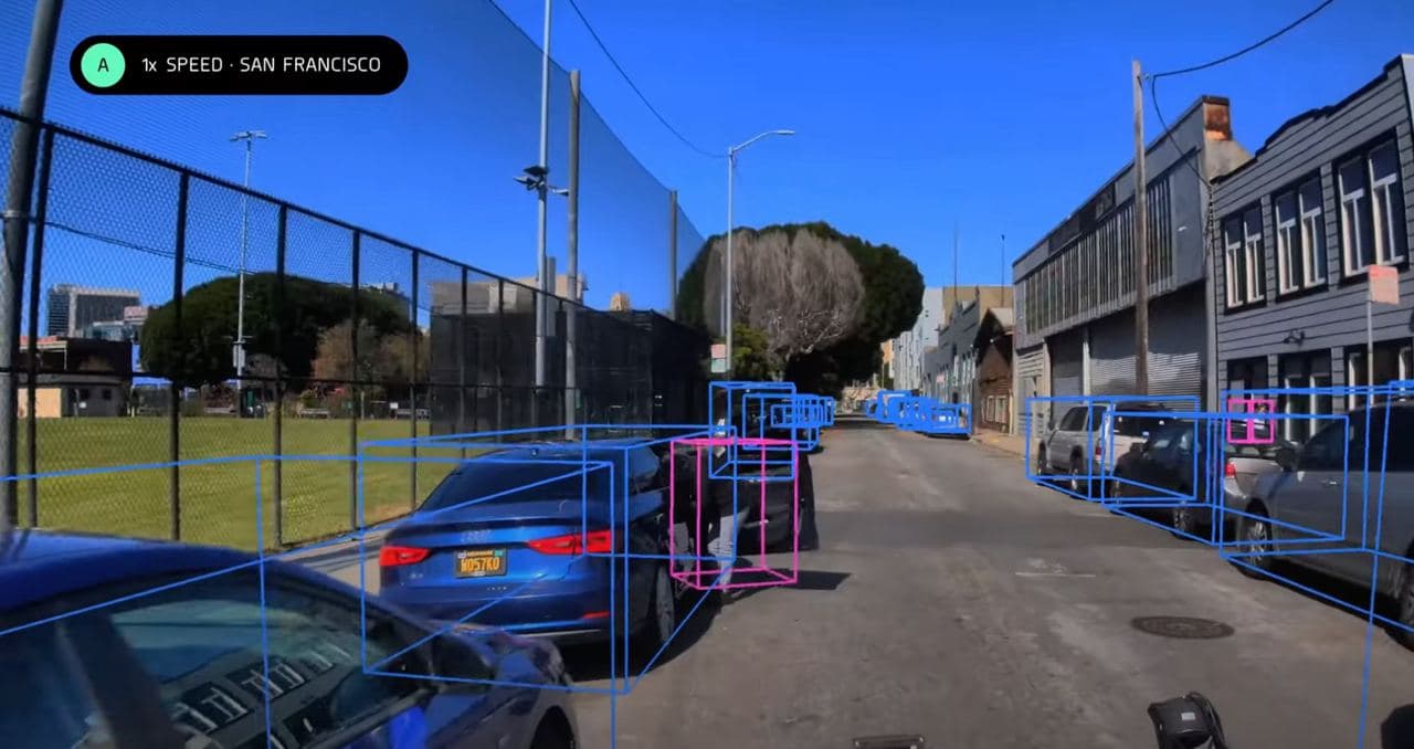 If you look closely at these images, you’ll notice many details. Objects in the scene are understood as parts of the environment, objects from the same class are labeled with the same color in their bounding boxes, and the 3D data from LiDARs and radars are combined with 2D images from cameras. Additionally, different objects are combined to extract more information from the scene, as it happens in the last image with the white car and its blinkers, reverse, and brake lights on.