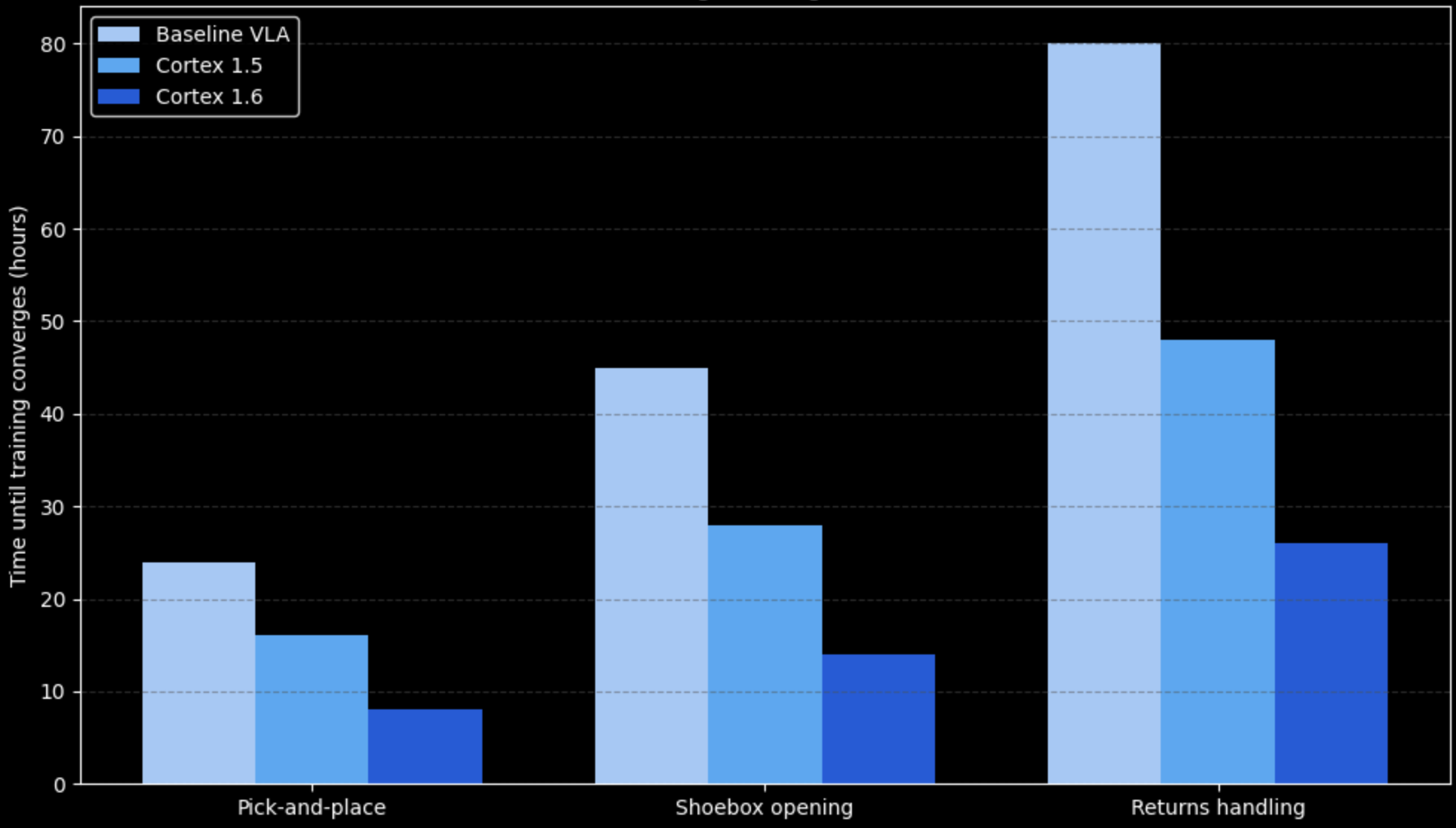 Across all workflows, Cortex 1.6 reduces convergence time by roughly 2× relative to Cortex 1.5 and by more than 3× compared to the baseline.