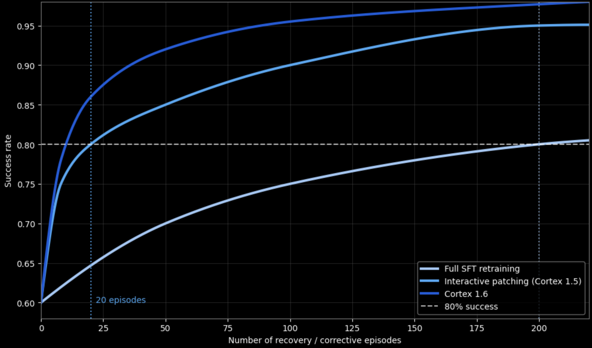 Compared to Cortex 1.5, which depends on explicit human intervention to trigger learning, Cortex 1.6 continues to improve autonomously during deployment. Dense reward signals extracted from routine operation enable learning even from successful but fragile executions that would otherwise provide no feedback.